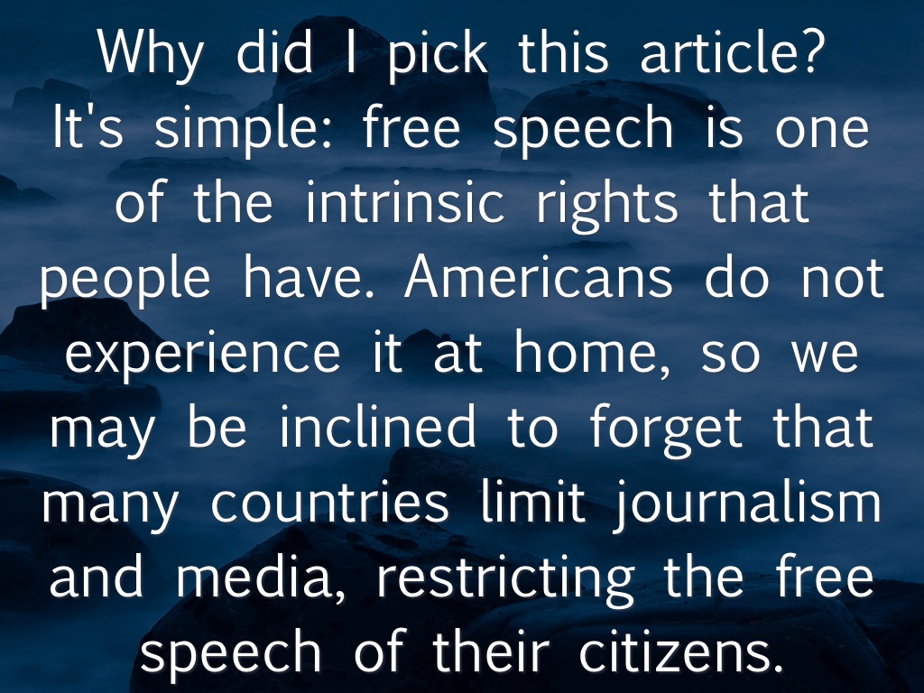 Why did I pick this article? It's simple: free speech is one of the intrinsic rights that people have. Americans do not experience it at home, so we may be inclined to forget that many countries limit journalism and media, restricting the free speech of their citizens.