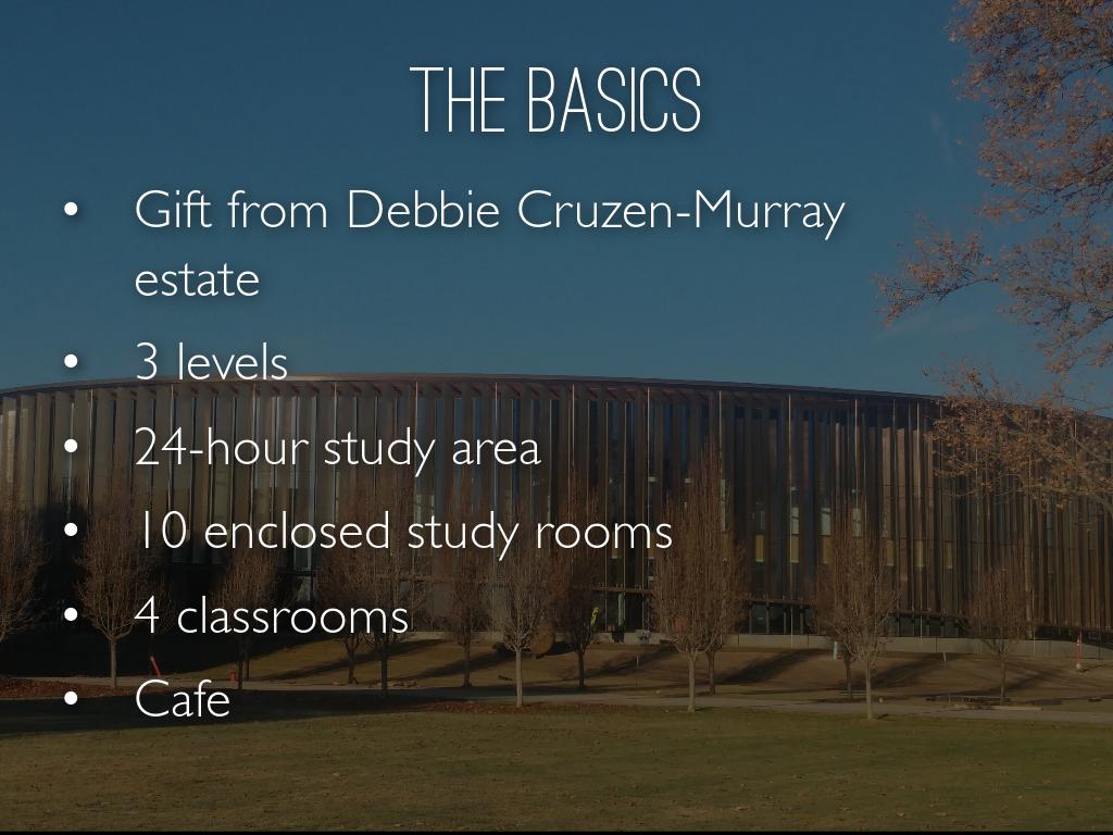 This deck provides an overview of the state-of-the-art Cruzen-Murray Library which opened at The College of Idaho in February, 2018. A generous gift from the estate of Debbie Cruzen-Murray and Richard Murray provided the funding for this incredible addition to the academic fabric of the campus. The 50,000 square foot elliptical building was designed by richard + bauer of Phoenix, AZ in Mid-Century Modern style and built by Kreizenbeck Constructors of Boise, ID.