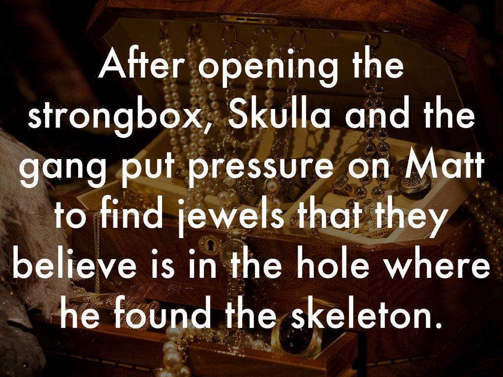 After opening the strongbox, Skulla and the gang put pressure on Matt to find jewels that they believe is in the hole where he found the skeleton.