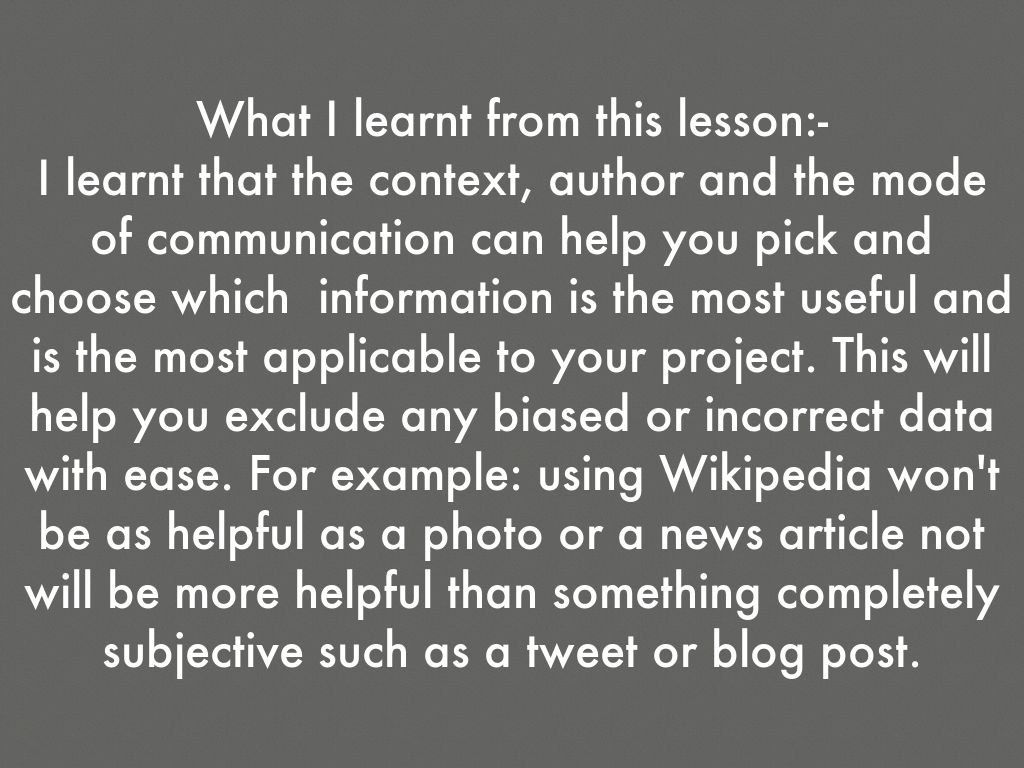 I learnt that the context, author and the mode of communication can help you pick and choose which information is the most useful and is the most applicable to your project. This will help you exclude any biased or incorrect data with ease. For example: using Wikipedia won't be as helpful as a photo or a news article not will be more helpful than something completely subjective such as a tweet or blog post.