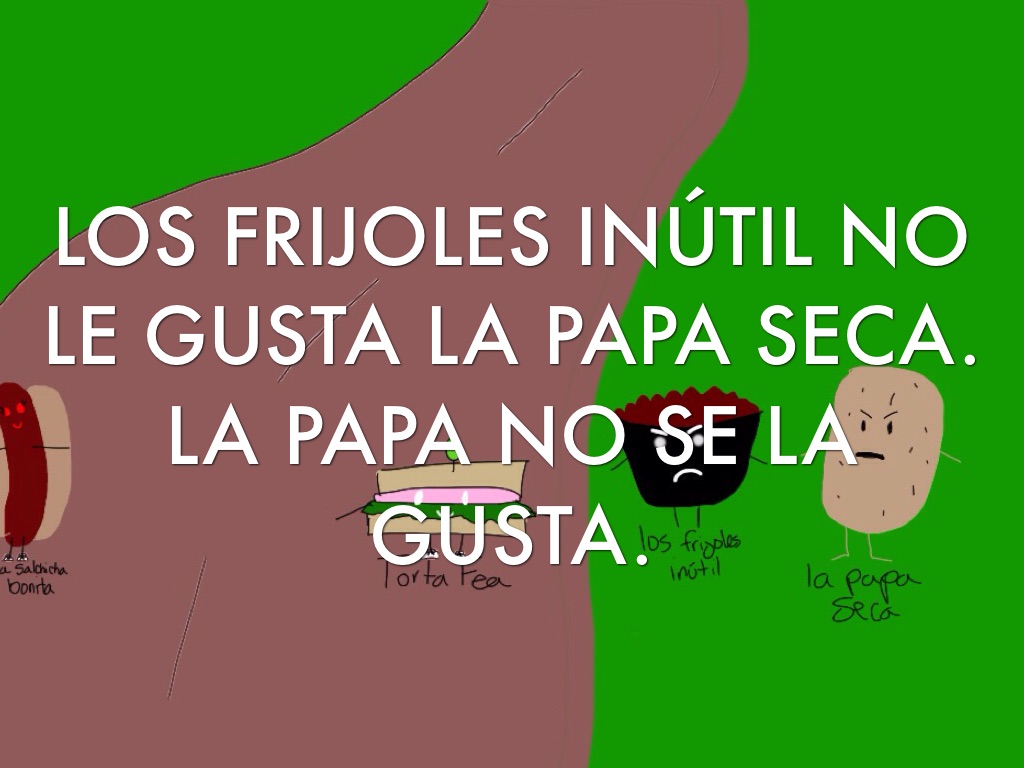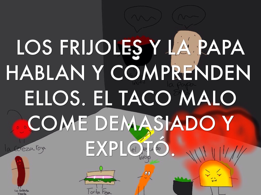 LOS FRIJOLES Y LA PAPA HABLAN Y COMPRENDEN ELLOS. EL TACO MALO COME DEMASIADO Y EXPLOTÓ.