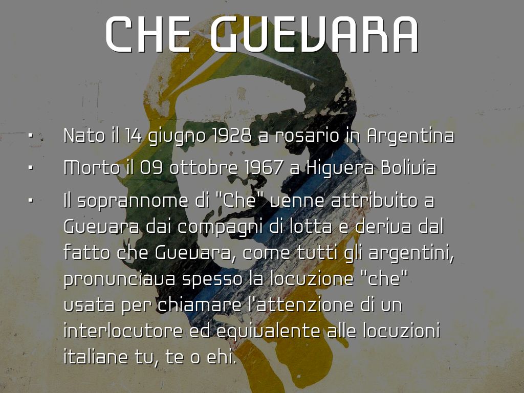 • Il soprannome di "Che" venne attribuito a Guevara dai compagni di lotta e deriva dal fatto che Guevara, come tutti gli argentini, pronunciava spesso la locuzione "che" usata per chiamare l'attenzione di un interlocutore ed equivalente alle locuzioni italiane tu, te o ehi.