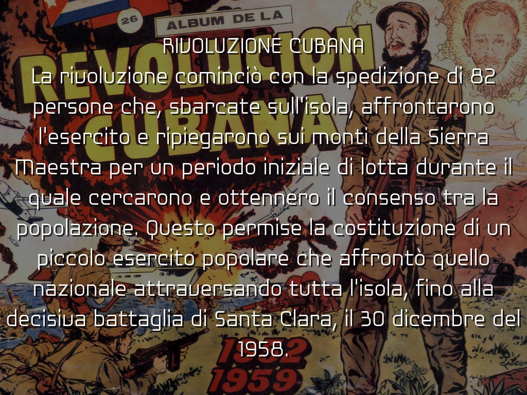 La rivoluzione cominciò con la spedizione di 82 persone che, sbarcate sull'isola, affrontarono l'esercito e ripiegarono sui monti della Sierra Maestra per un periodo iniziale di lotta durante il quale cercarono e ottennero il consenso tra la popolazione. Questo permise la costituzione di un piccolo esercito popolare che affrontò quello nazionale attraversando tutta l'isola, fino alla decisiva battaglia di Santa Clara, il 30 dicembre del 1958.