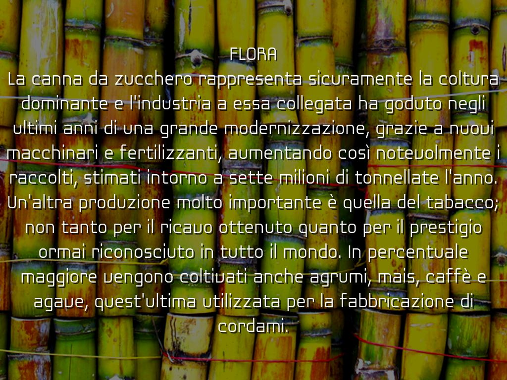 La canna da zucchero rappresenta sicuramente la coltura dominante e l'industria a essa collegata ha goduto negli ultimi anni di una grande modernizzazione, grazie a nuovi macchinari e fertilizzanti, aumentando così notevolmente i raccolti, stimati intorno a sette milioni di tonnellate l'anno. Un'altra produzione molto importante è quella del tabacco; non tanto per il ricavo ottenuto quanto per il prestigio ormai riconosciuto in tutto il mondo. In percentuale maggiore vengono coltivati anche agrumi, mais, caffè e agave, quest'ultima utilizzata per la fabbricazione di cordami.