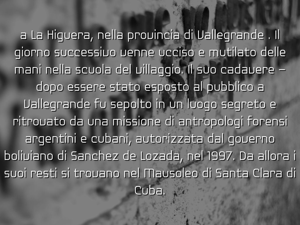 a La Higuera, nella provincia di Vallegrande . Il giorno successivo venne ucciso e mutilato delle mani nella scuola del villaggio. Il suo cadavere – dopo essere stato esposto al pubblico a Vallegrande fu sepolto in un luogo segreto e ritrovato da una missione di antropologi forensi argentini e cubani, autorizzata dal governo boliviano di Sanchez de Lozada, nel 1997. Da allora i suoi resti si trovano nel Mausoleo di Santa Clara di Cuba.