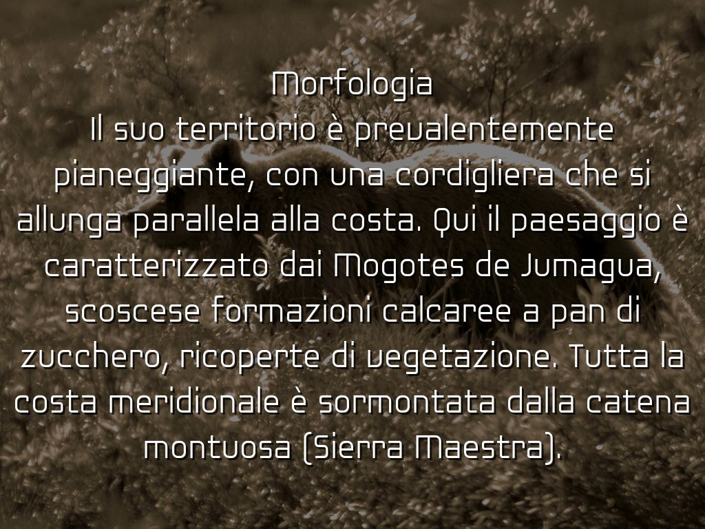 Il suo territorio è prevalentemente pianeggiante, con una cordigliera che si allunga parallela alla costa. Qui il paesaggio è caratterizzato dai Mogotes de Jumagua, scoscese formazioni calcaree a pan di zucchero, ricoperte di vegetazione. Tutta la costa meridionale è sormontata dalla catena montuosa (Sierra Maestra).