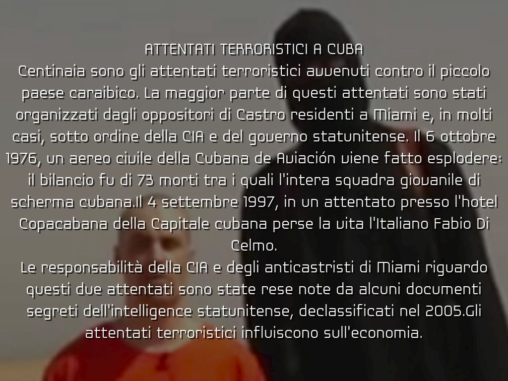 Centinaia sono gli attentati terroristici avvenuti contro il piccolo paese caraibico. La maggior parte di questi attentati sono stati organizzati dagli oppositori di Castro residenti a Miami e, in molti casi, sotto ordine della CIA e del governo statunitense. Il 6 ottobre 1976, un aereo civile della Cubana de Aviación viene fatto esplodere: il bilancio fu di 73 morti tra i quali l'intera squadra giovanile di scherma cubana.Il 4 settembre 1997, in un attentato presso l'hotel Copacabana della Capitale cubana perse la vita l'Italiano Fabio Di Celmo.