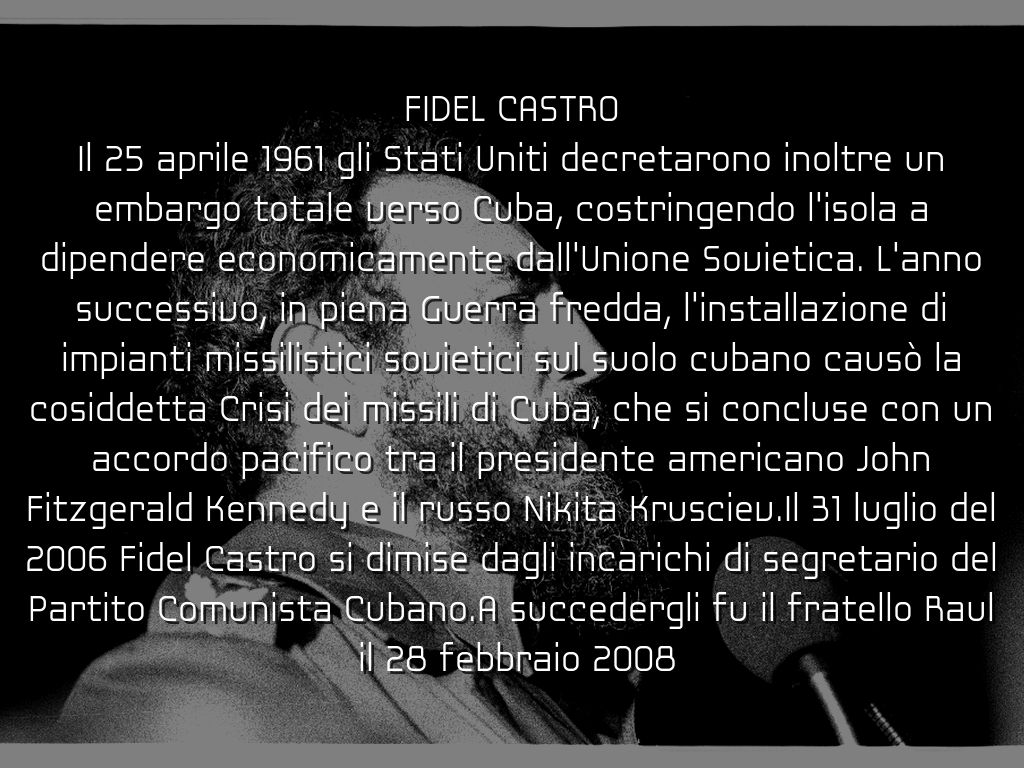 Il 25 aprile 1961 gli Stati Uniti decretarono inoltre un embargo totale verso Cuba, costringendo l'isola a dipendere economicamente dall'Unione Sovietica. L'anno successivo, in piena Guerra fredda, l'installazione di impianti missilistici sovietici sul suolo cubano causò la cosiddetta Crisi dei missili di Cuba, che si concluse con un accordo pacifico tra il presidente americano John Fitzgerald Kennedy e il russo Nikita Krusciev.Il 31 luglio del 2006 Fidel Castro si dimise dagli incarichi di segretario del Partito Comunista Cubano.A succedergli fu il fratello Raul il 28 febbraio 2008