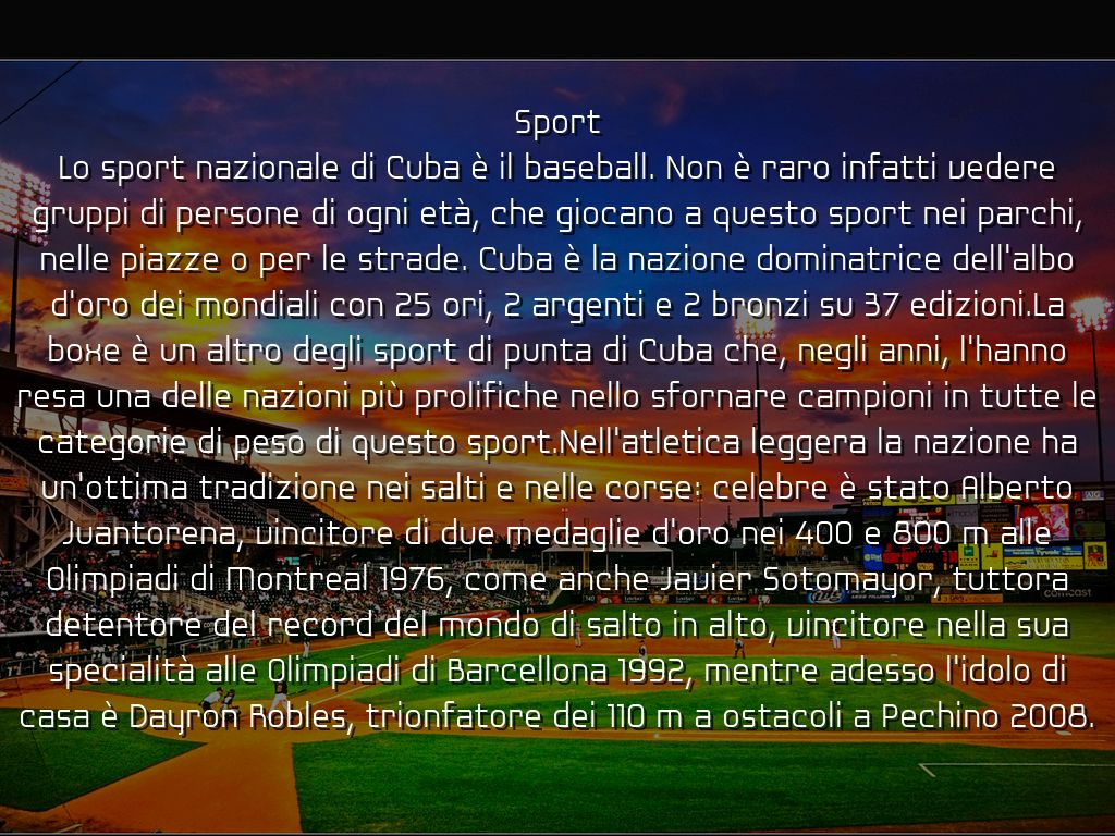 Lo sport nazionale di Cuba è il baseball. Non è raro infatti vedere gruppi di persone di ogni età, che giocano a questo sport nei parchi, nelle piazze o per le strade. Cuba è la nazione dominatrice dell'albo d'oro dei mondiali con 25 ori, 2 argenti e 2 bronzi su 37 edizioni.La boxe è un altro degli sport di punta di Cuba che, negli anni, l'hanno resa una delle nazioni più prolifiche nello sfornare campioni in tutte le categorie di peso di questo sport.Nell'atletica leggera la nazione ha un'ottima tradizione nei salti e nelle corse: celebre è stato Alberto Juantorena, vincitore di due medaglie d'oro nei 400 e 800 m alle Olimpiadi di Montreal 1976, come anche Javier Sotomayor, tuttora detentore del record del mondo di salto in alto, vincitore nella sua specialità alle Olimpiadi di Barcellona 1992, mentre adesso l'idolo di casa è Dayron Robles, trionfatore dei 110 m a ostacoli a Pechino 2008.