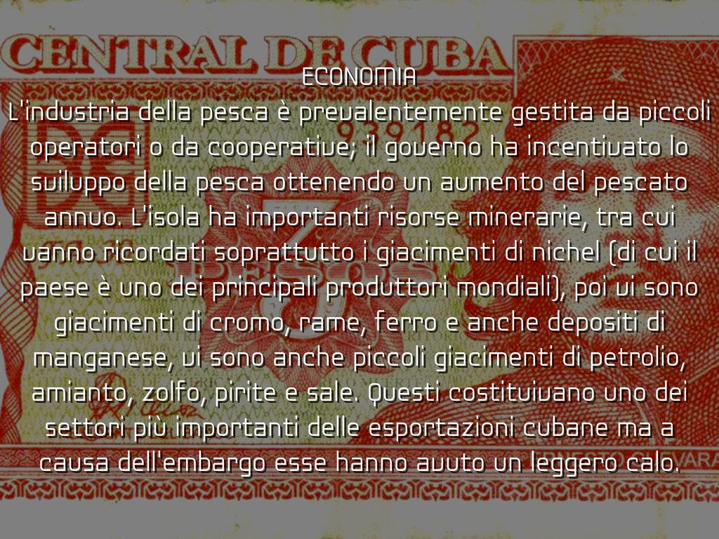 L'industria della pesca è prevalentemente gestita da piccoli operatori o da cooperative; il governo ha incentivato lo sviluppo della pesca ottenendo un aumento del pescato annuo. L'isola ha importanti risorse minerarie, tra cui vanno ricordati soprattutto i giacimenti di nichel (di cui il paese è uno dei principali produttori mondiali), poi vi sono giacimenti di cromo, rame, ferro e anche depositi di manganese, vi sono anche piccoli giacimenti di petrolio, amianto, zolfo, pirite e sale. Questi costituivano uno dei settori più importanti delle esportazioni cubane ma a causa dell'embargo esse hanno avuto un leggero calo.