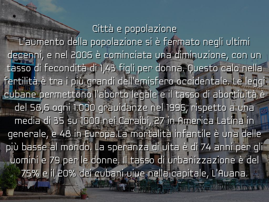 L'aumento della popolazione si è fermato negli ultimi decenni, e nel 2006 è cominciata una diminuzione, con un tasso di fecondità di 1,43 figli per donna. Questo calo nella fertilità è tra i più grandi dell'emisfero occidentale. Le leggi cubane permettono l'aborto legale e il tasso di abortività è del 58,6 ogni 1.000 gravidanze nel 1996, rispetto a una media di 35 su 1000 nei Caraibi, 27 in America Latina in generale, e 48 in Europa.La mortalità infantile è una delle più basse al mondo. La speranza di vita è di 74 anni per gli uomini e 79 per le donne. Il tasso di urbanizzazione è del 75% e il 20% dei cubani vive nella capitale, L'Avana.
