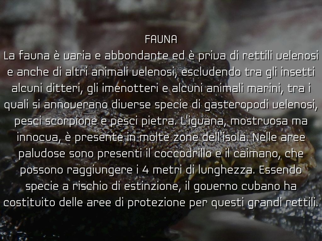 La fauna è varia e abbondante ed è priva di rettili velenosi e anche di altri animali velenosi, escludendo tra gli insetti alcuni ditteri, gli imenotteri e alcuni animali marini, tra i quali si annoverano diverse specie di gasteropodi velenosi, pesci scorpione e pesci pietra. L'iguana, mostruosa ma innocua, è presente in molte zone dell'isola. Nelle aree paludose sono presenti il coccodrillo e il caimano, che possono raggiungere i 4 metri di lunghezza. Essendo specie a rischio di estinzione, il governo cubano ha costituito delle aree di protezione per questi grandi rettili.