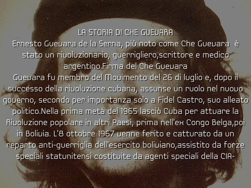 Guevara fu membro del Movimento del 26 di luglio e, dopo il successo della rivoluzione cubana, assunse un ruolo nel nuovo governo, secondo per importanza solo a Fidel Castro, suo alleato politico.Nella prima metà del 1965 lasciò Cuba per attuare la Rivoluzione popolare in altri Paesi, prima nell'ex Congo Belga,poi in Bolivia. L'8 ottobre 1967 venne ferito e catturato da un reparto anti-guerriglia dell'esercito boliviano,assistito da forze speciali statunitensi costituite da agenti speciali della CIA-