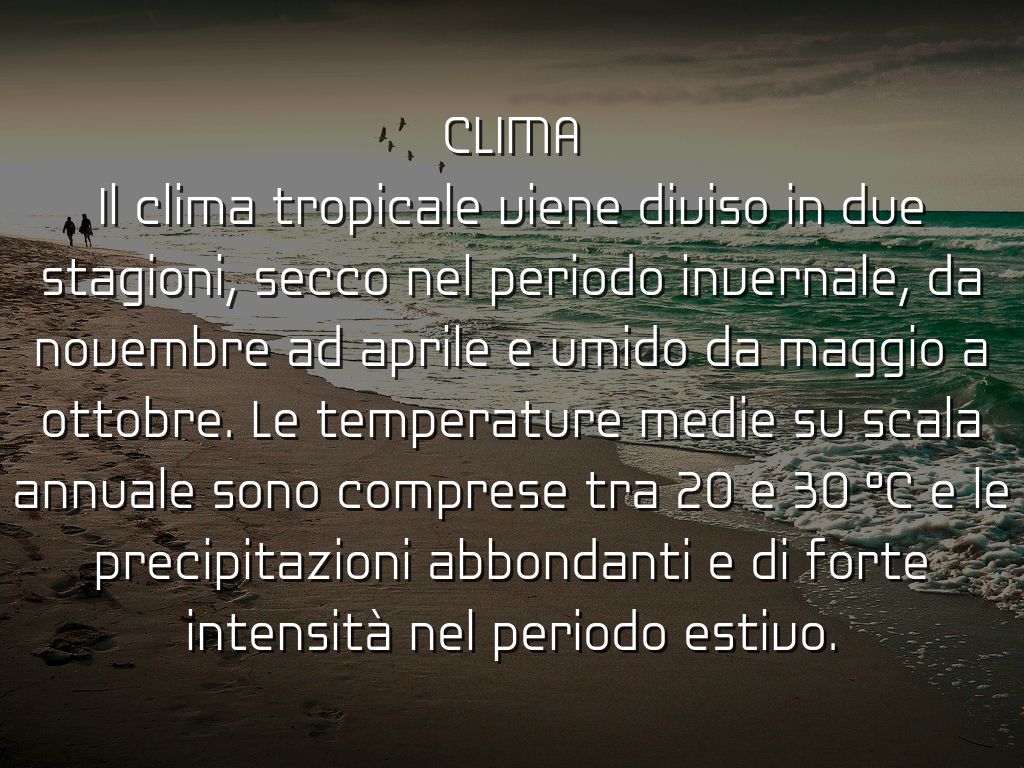 Il clima tropicale viene diviso in due stagioni, secco nel periodo invernale, da novembre ad aprile e umido da maggio a ottobre. Le temperature medie su scala annuale sono comprese tra 20 e 30 °C e le precipitazioni abbondanti e di forte intensità nel periodo estivo.
