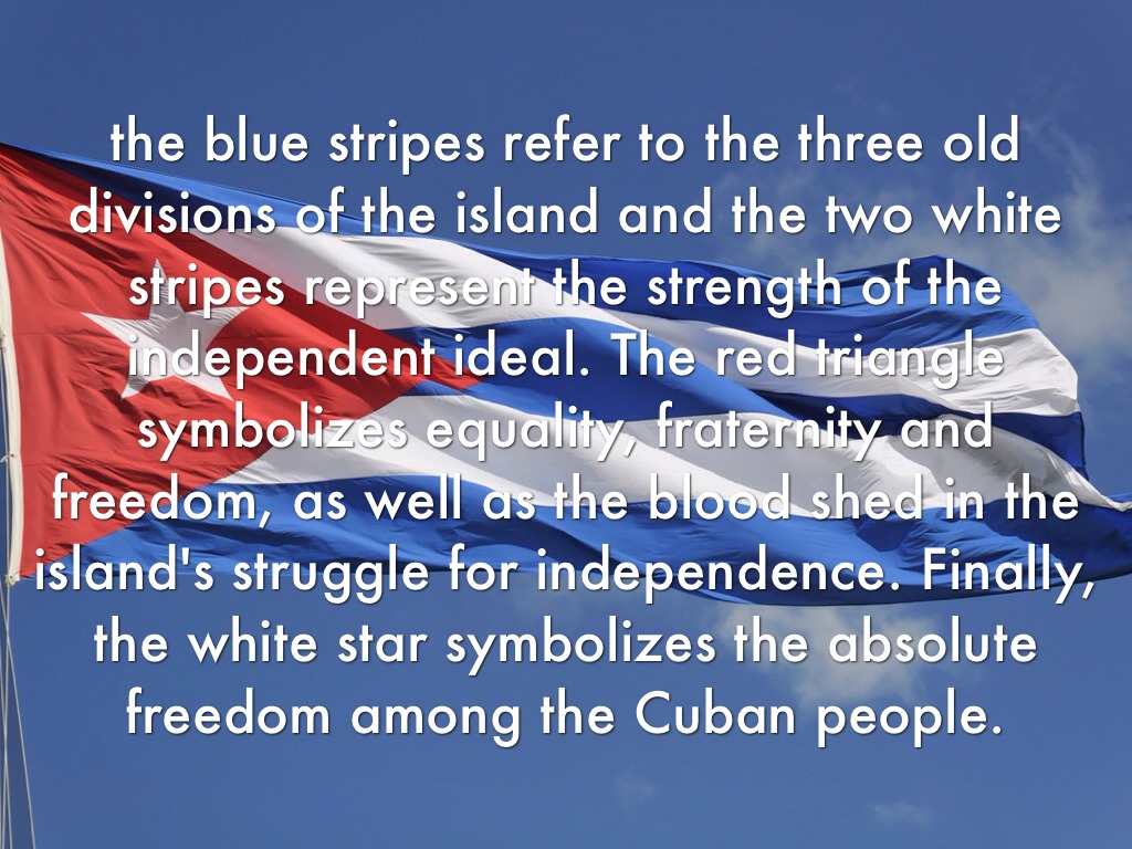 the blue stripes refer to the three old divisions of the island and the two white stripes represent the strength of the independent ideal. The red triangle symbolizes equality, fraternity and freedom, as well as the blood shed in the island's struggle for independence. Finally, the white star symbolizes the absolute freedom among the Cuban people.