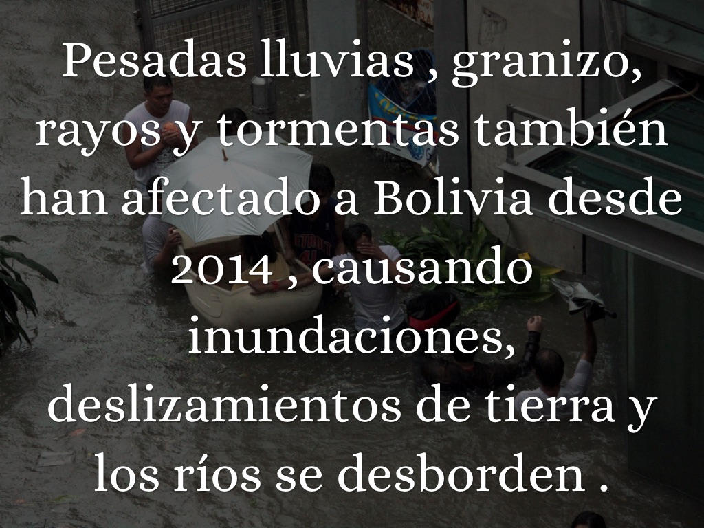 Pesadas lluvias , granizo, rayos y tormentas también han afectado a Bolivia desde 2014 , causando inundaciones, deslizamientos de tierra y los ríos se desborden .