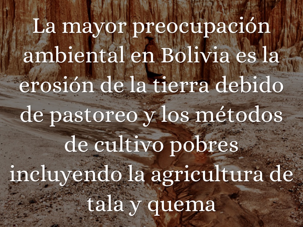 La mayor preocupación ambiental en Bolivia es la erosión de la tierra debido de pastoreo y los métodos de cultivo pobres incluyendo la agricultura de tala y quema