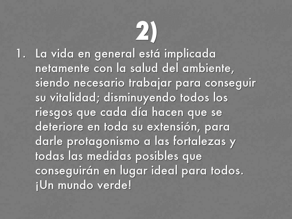 - La vida en general está implicada netamente con la salud del ambiente, siendo necesario trabajar para conseguir su vitalidad; disminuyendo todos los riesgos que cada día hacen que se deteriore en toda su extensión, para darle protagonismo a las fortalezas y todas las medidas posibles que conseguirán en lugar ideal para todos. ¡Un mundo verde!