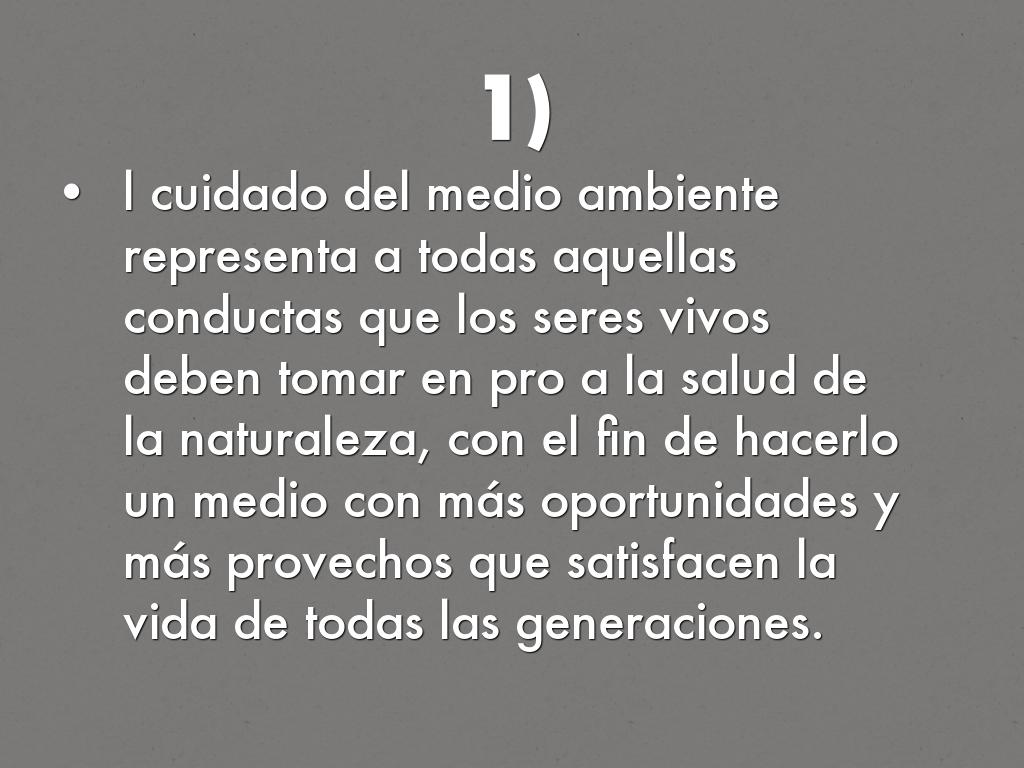 - l cuidado del medio ambiente representa a todas aquellas conductas que los seres vivos deben tomar en pro a la salud de la naturaleza, con el fin de hacerlo un medio con más oportunidades y más provechos que satisfacen la vida de todas las generaciones.