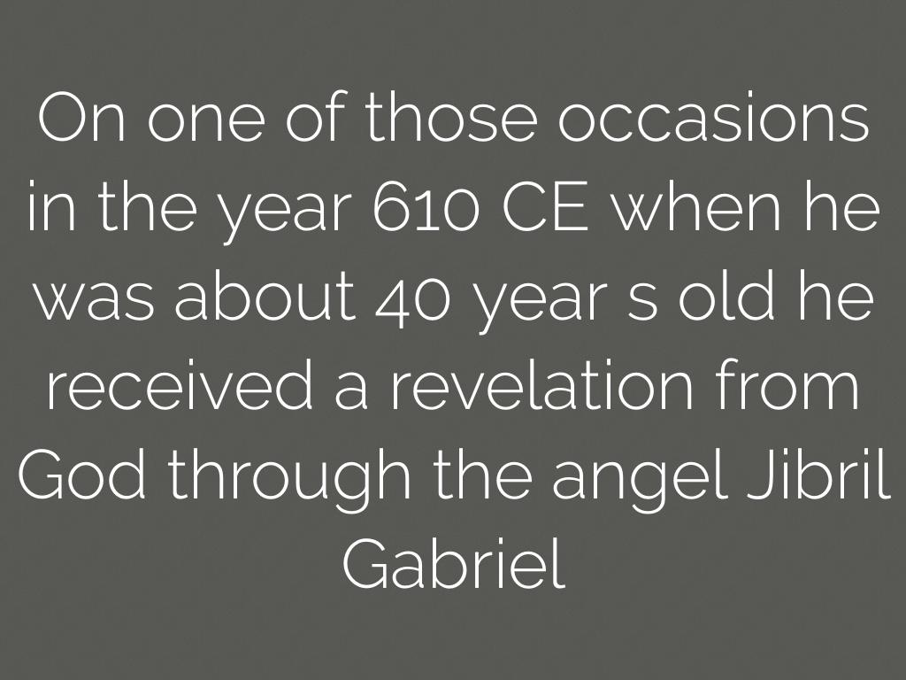 On one of those occasions in the year 610 CE when he was about 40 year s old he received a revelation from God through the angel Jibril Gabriel