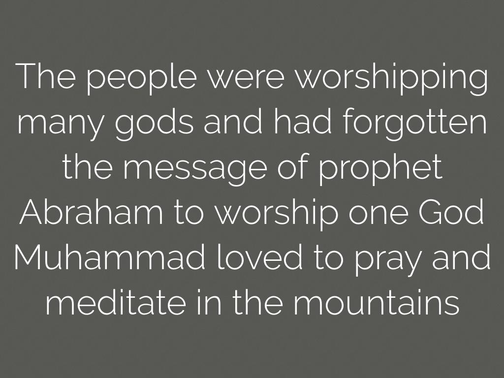 The people were worshipping many gods and had forgotten the message of prophet Abraham to worship one God Muhammad loved to pray and meditate in the mountains