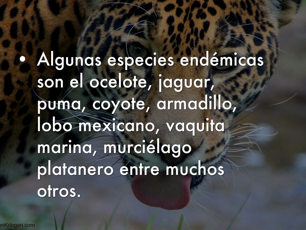Algunas especies endémicas son el ocelote, jaguar, puma, coyote, armadillo, lobo mexicano, vaquita marina, murciélago platanero entre muchos otros.