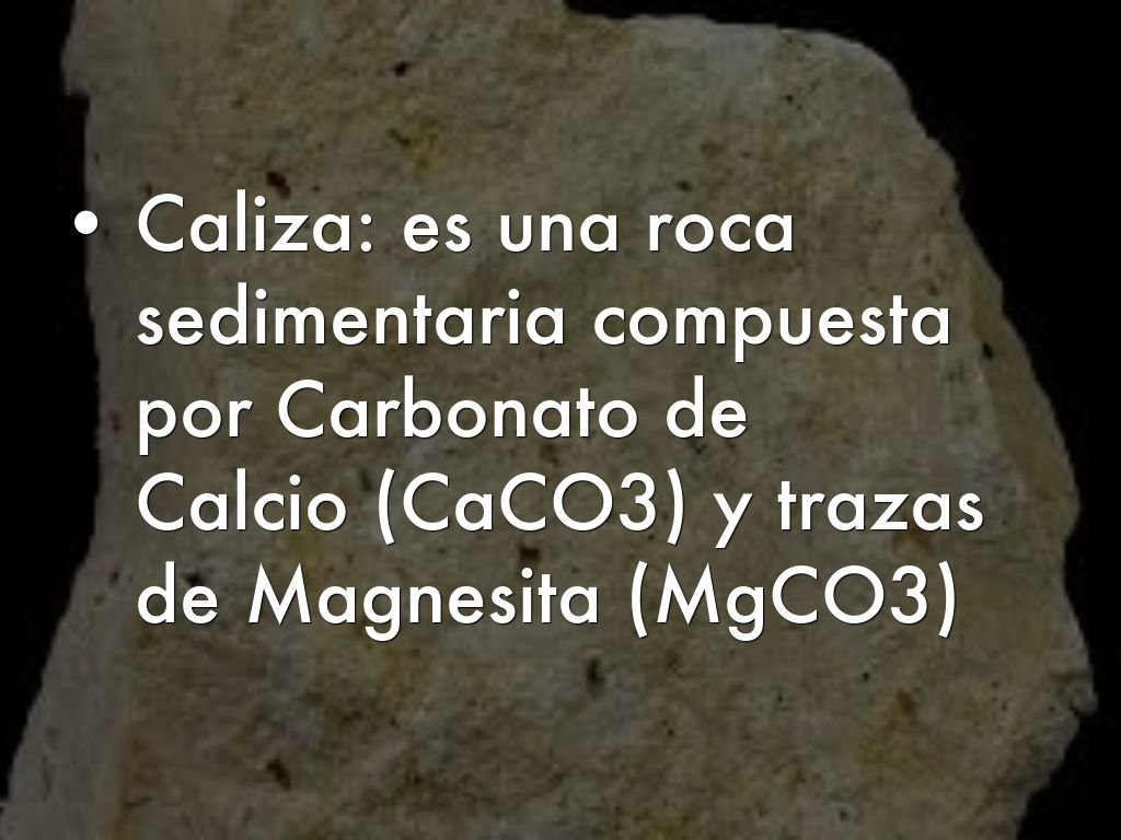 Caliza: es una roca sedimentaria compuesta por Carbonato de Calcio (CaCO3) y trazas de Magnesita (MgCO3)