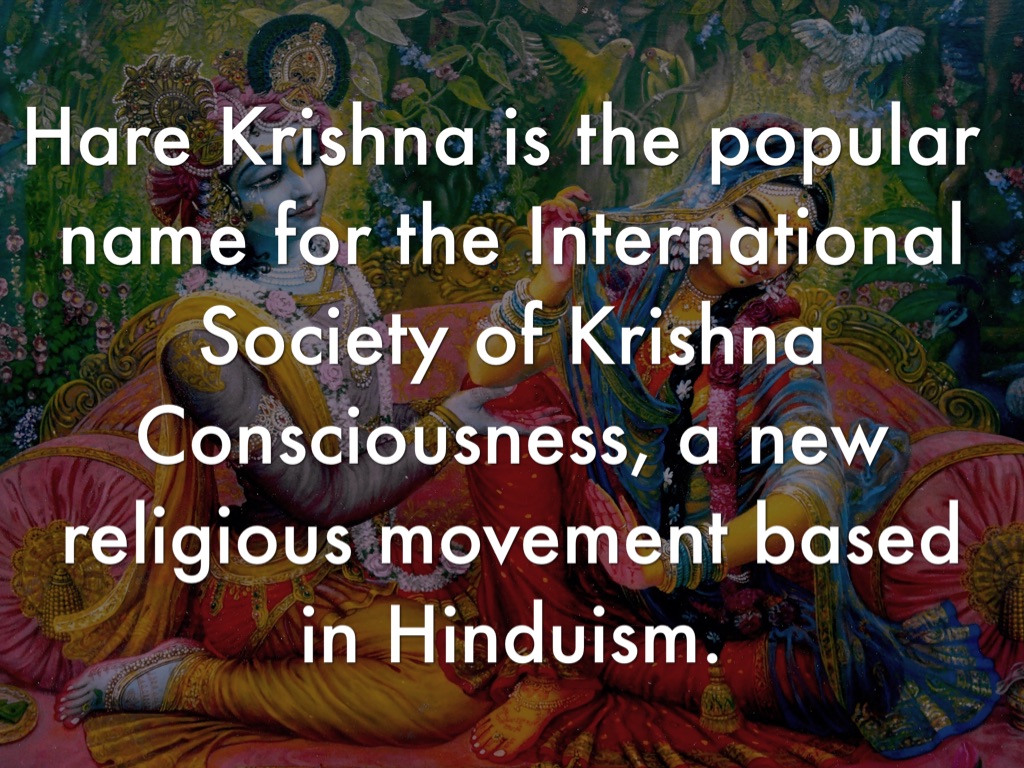 Hare Krishna is the popular name for the International Society of Krishna Consciousness, a new religious movement based in Hinduism.