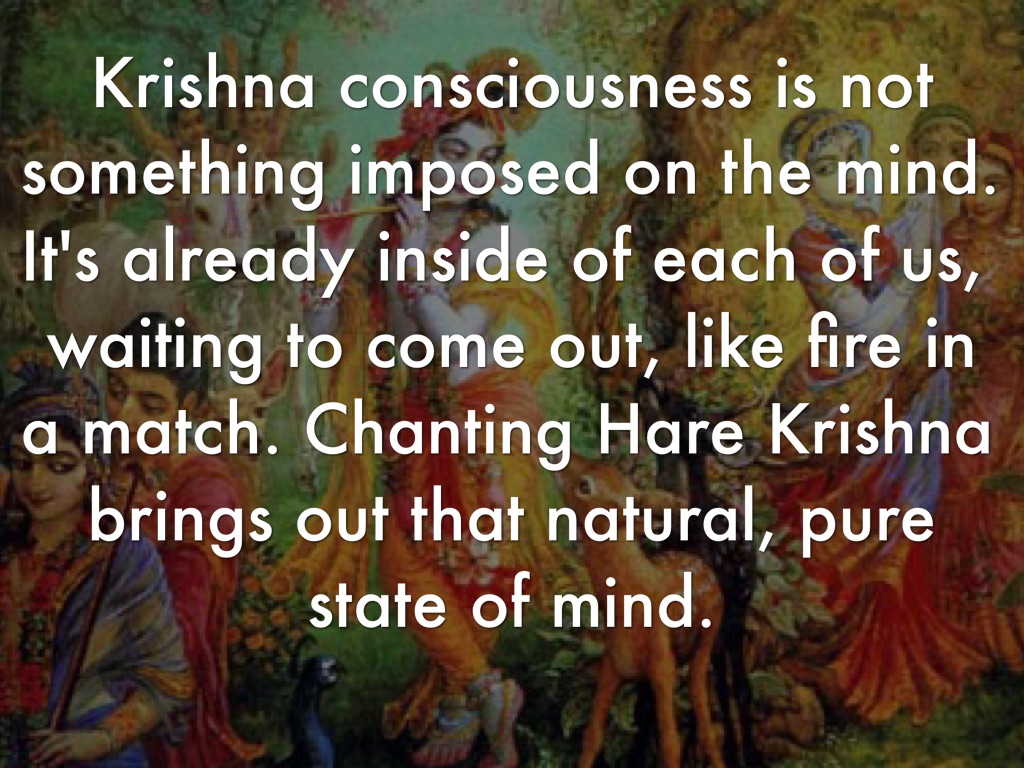Krishna consciousness is not something imposed on the mind. It's already inside of each of us, waiting to come out, like fire in a match. Chanting Hare Krishna brings out that natural, pure state of mind.