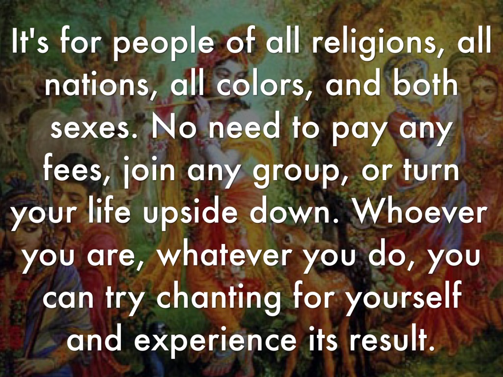 It's for people of all religions, all nations, all colors, and both sexes. No need to pay any fees, join any group, or turn your life upside down. Whoever you are, whatever you do, you can try chanting for yourself and experience its result.