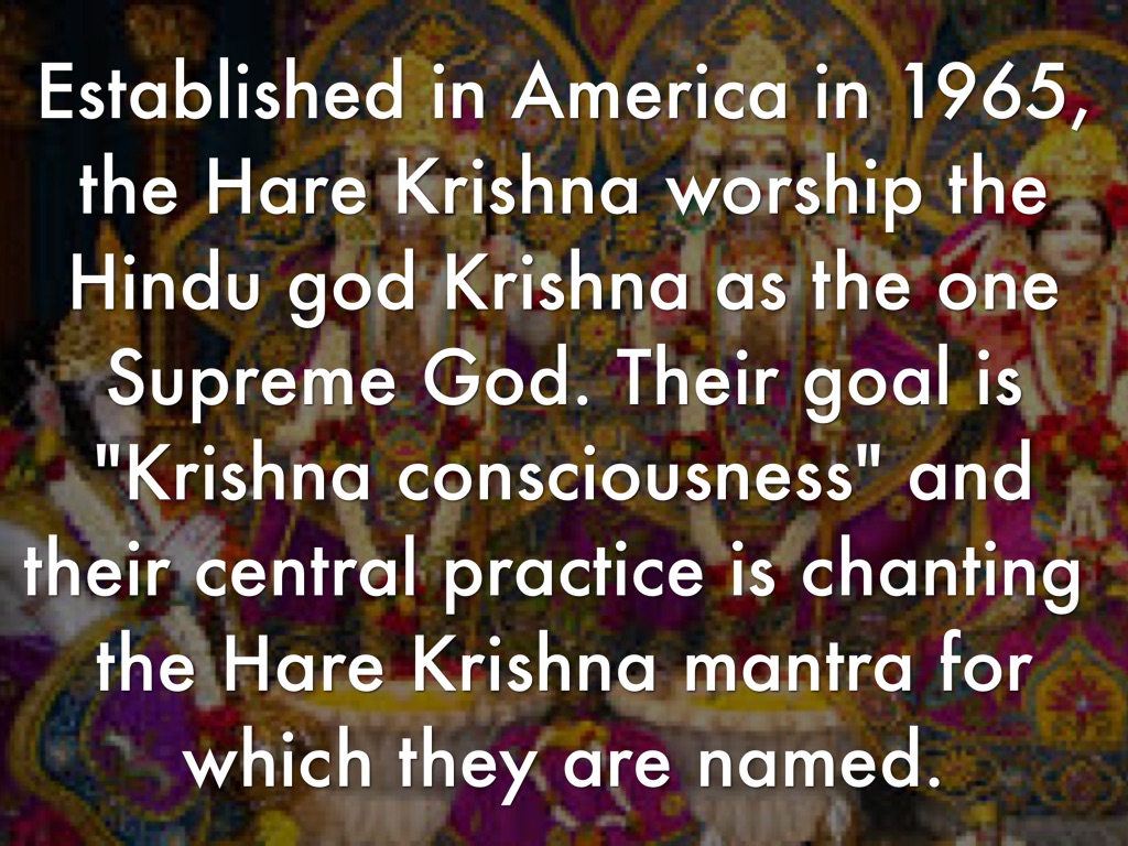 Established in America in 1965, the Hare Krishna worship the Hindu god Krishna as the one Supreme God. Their goal is "Krishna consciousness" and their central practice is chanting the Hare Krishna mantra for which they are named.
