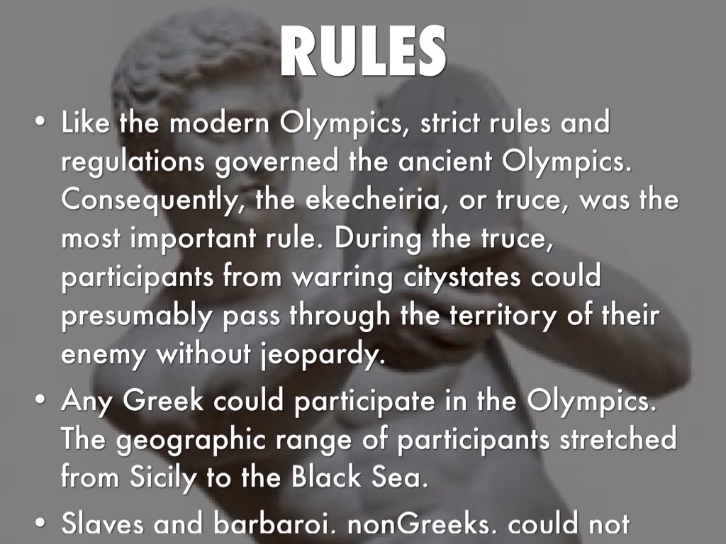 Like the modern Olympics, strict rules and regulations governed the ancient Olympics. Consequently, the ekecheiria, or truce, was the most important rule. During the truce, participants from warring citystates could presumably pass through the territory of their enemy without jeopardy.