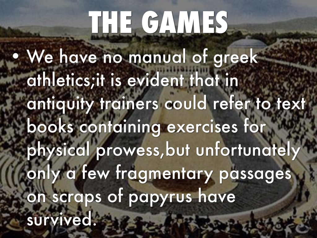 We have no manual of greek athletics;it is evident that in antiquity trainers could refer to text books containing exercises for physical prowess,but unfortunately only a few fragmentary passages on scraps of papyrus have survived.