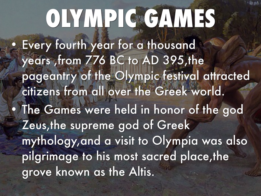 The Games were held in honor of the god Zeus,the supreme god of Greek mythology,and a visit to Olympia was also pilgrimage to his most sacred place,the grove known as the Altis.