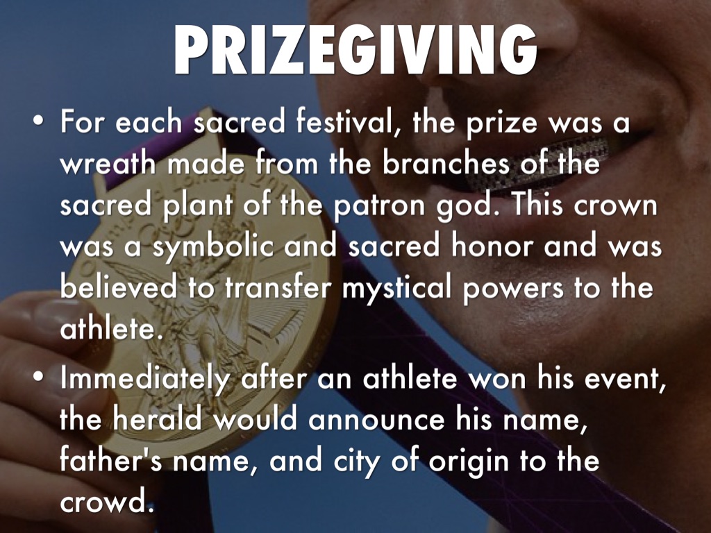 Immediately after an athlete won his event, the herald would announce his name, father's name, and city of origin to the crowd.