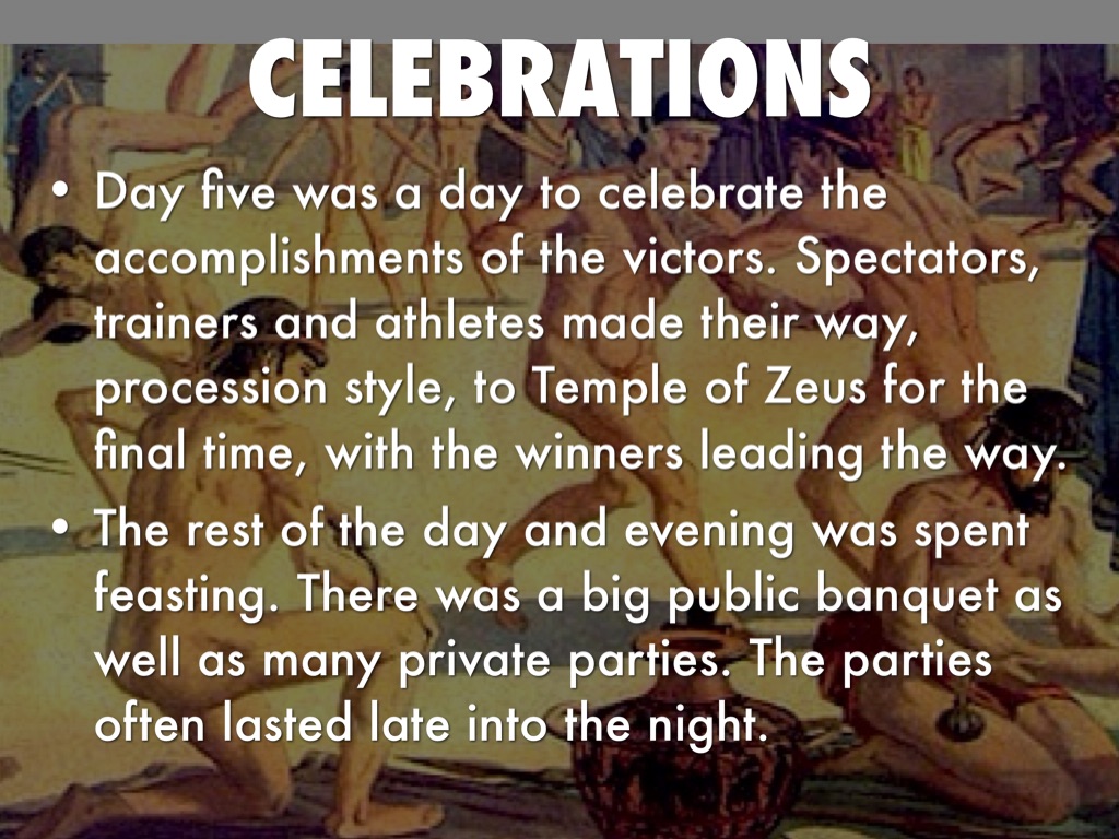 The rest of the day and evening was spent feasting. There was a big public banquet as well as many private parties. The parties often lasted late into the night.