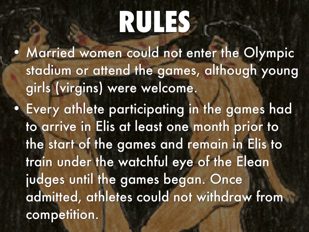 Married women could not enter the Olympic stadium or attend the games, although young girls (virgins) were welcome.