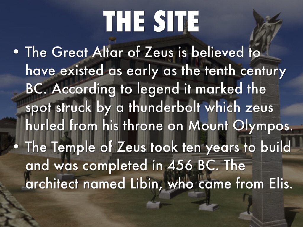 The Temple of Zeus took ten years to build and was completed in 456 BC. The architect named Libin, who came from Elis.