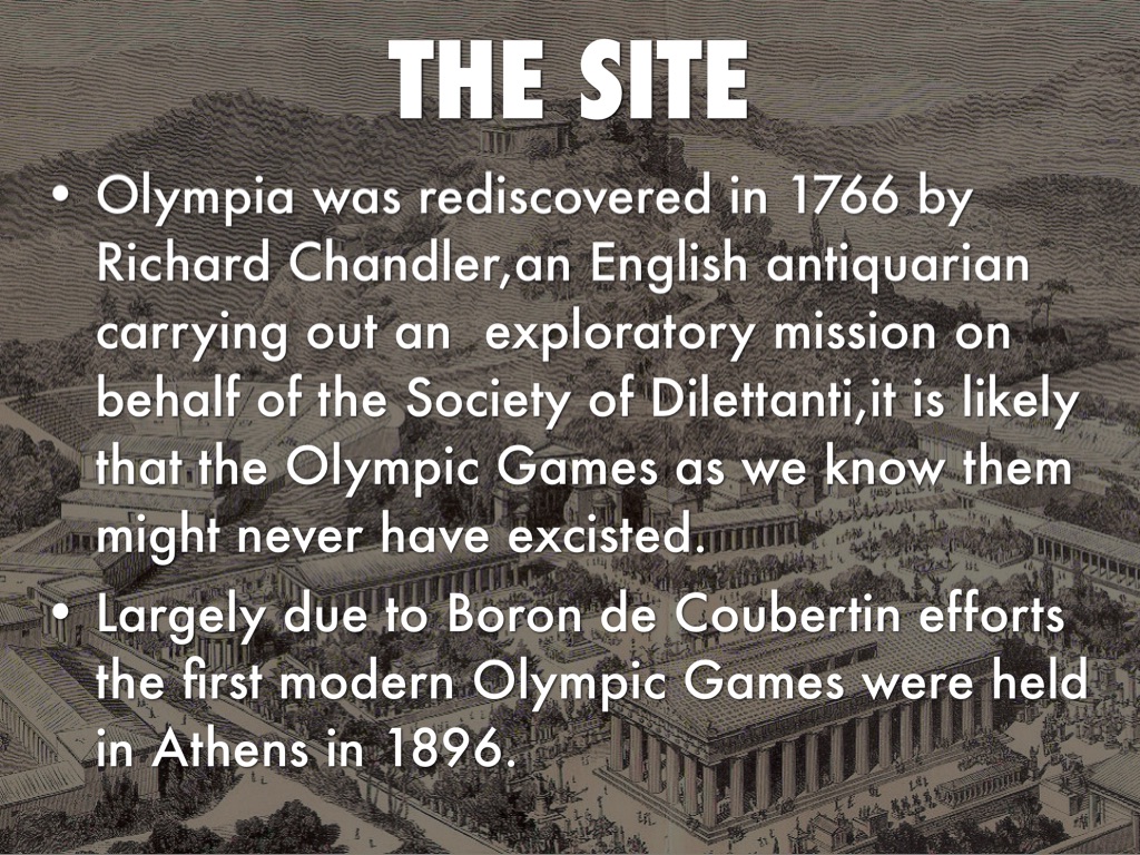 Olympia was rediscovered in 1766 by Richard Chandler,an English antiquarian carrying out an exploratory mission on behalf of the Society of Dilettanti,it is likely that the Olympic Games as we know them might never have excisted.