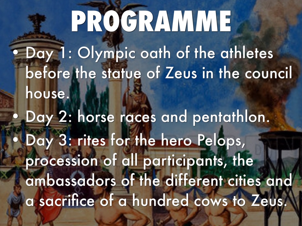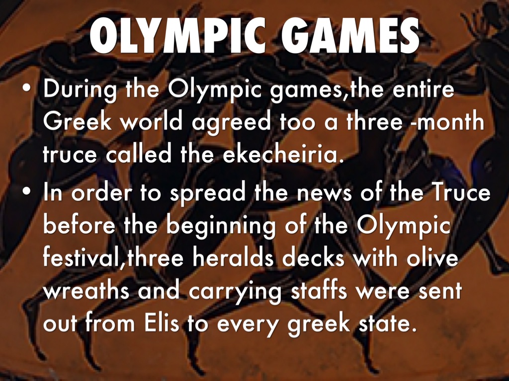 In order to spread the news of the Truce before the beginning of the Olympic festival,three heralds decks with olive wreaths and carrying staffs were sent out from Elis to every greek state.