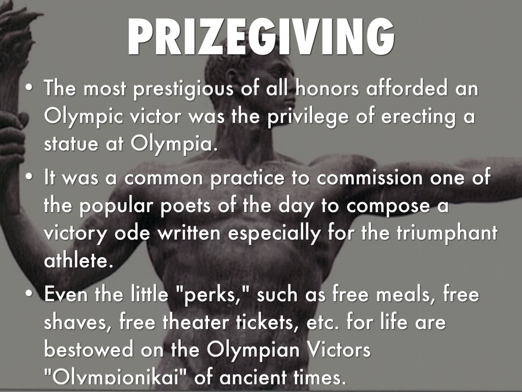 Even the little "perks," such as free meals, free shaves, free theater tickets, etc. for life are bestowed on the Olympian Victors "Olympionikai" of ancient times.