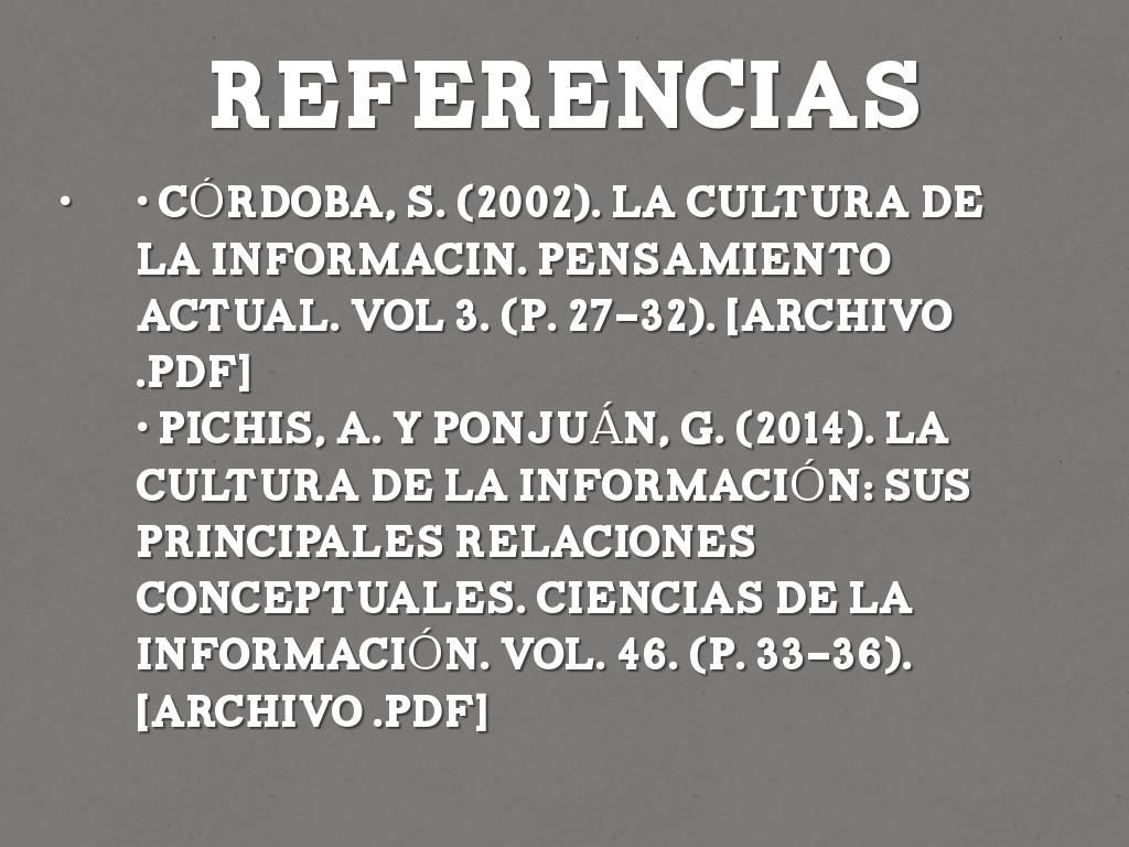 • CÓrdoba, S. (2002). La Cultura de la Informacin. Pensamiento Actual. Vol 3. (p. 27-32). [Archivo .PDF]