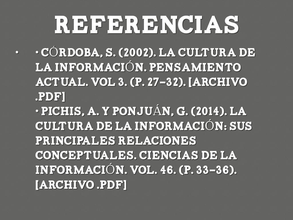 • Pichis, A. y PonjuÁn, G. (2014). La Cultura de la InformaciÓn: sus principales relaciones conceptuales. Ciencias de la InformaciÓn. Vol. 46. (p. 33-36). [Archivo .PDF]