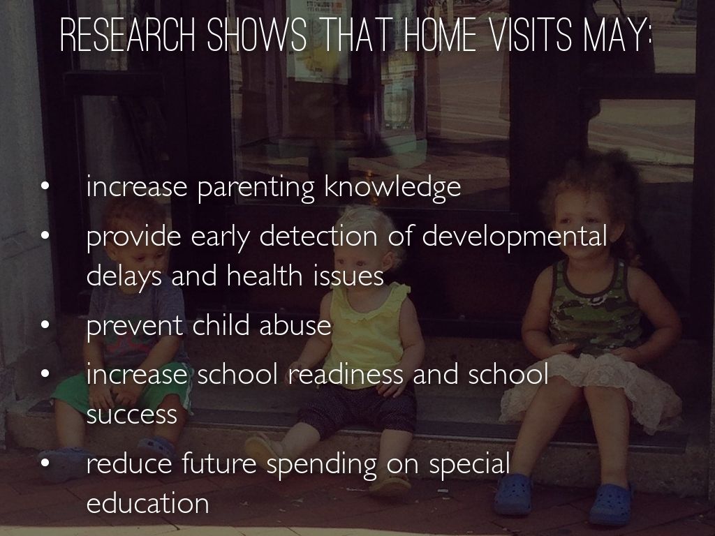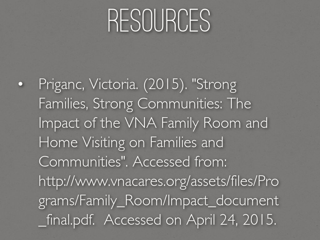 Priganc, Victoria. (2015). "Strong Families, Strong Communities: The Impact of the VNA Family Room and Home Visiting on Families and Communities". Accessed from: