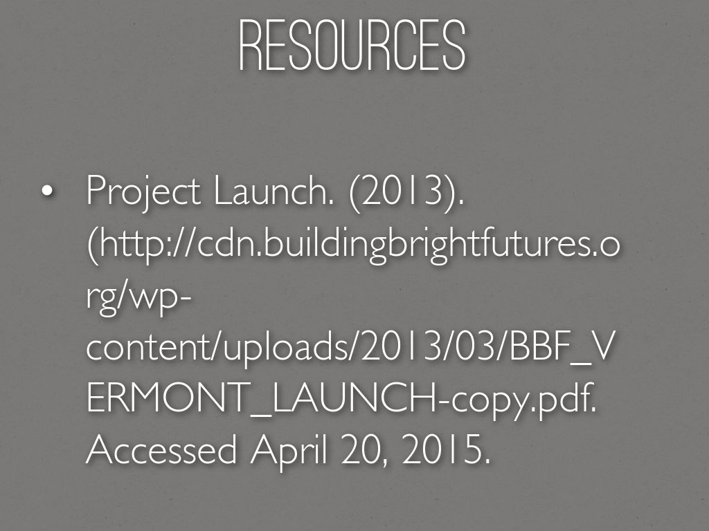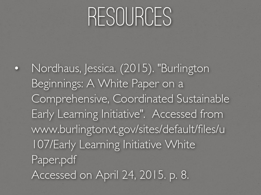 Nordhaus, Jessica. (2015). "Burlington Beginnings: A White Paper on a Comprehensive, Coordinated Sustainable Early Learning Initiative". Accessed from