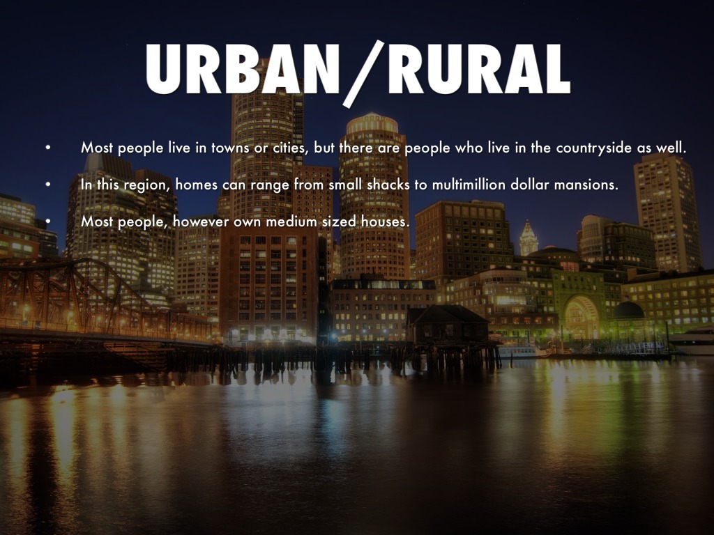 Most people live in towns or cities, but there are people who live in the countryside as well.
