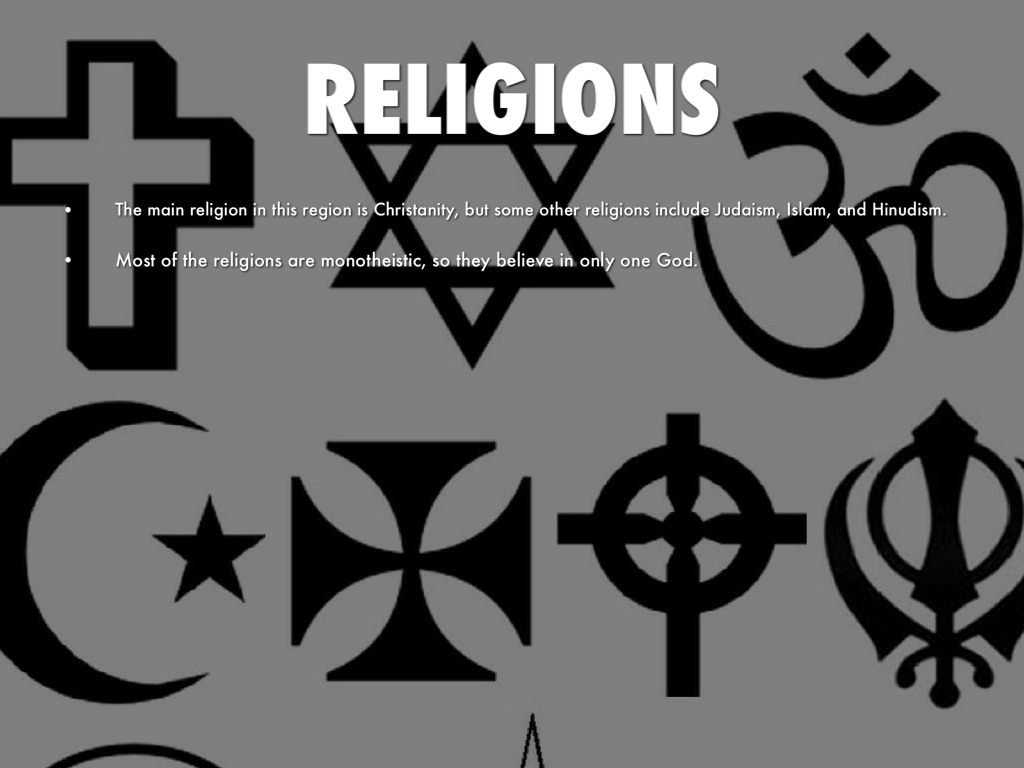 The main religion in this region is Christanity, but some other religions include Judaism, Islam, and Hinudism.
