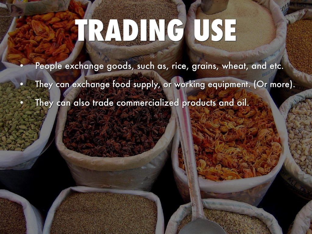 People exchange goods, such as, rice, grains, wheat, and etc.