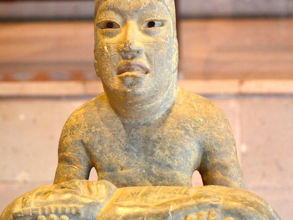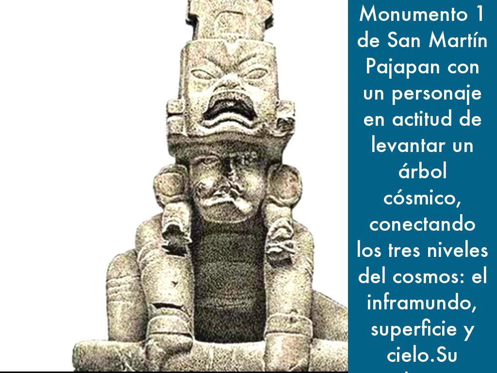 Monumento 1 de San Martín Pajapan con un personaje en actitud de levantar un árbol cósmico, conectando los tres niveles del cosmos: el inframundo, superficie y cielo.Su tocado es una representación del dios del maíz.