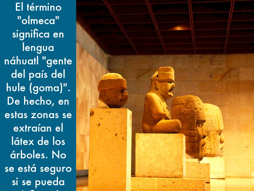 El término "olmeca" significa en lengua náhuatl "gente del país del hule (goma)". De hecho, en estas zonas se extraían el látex de los árboles. No se está seguro si se pueda definir el término olmeca.